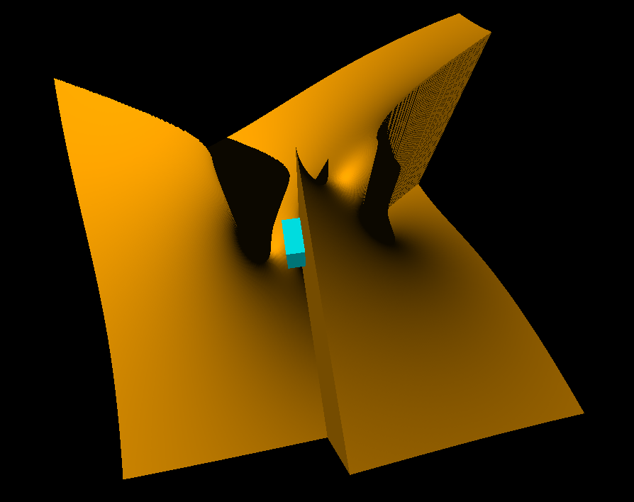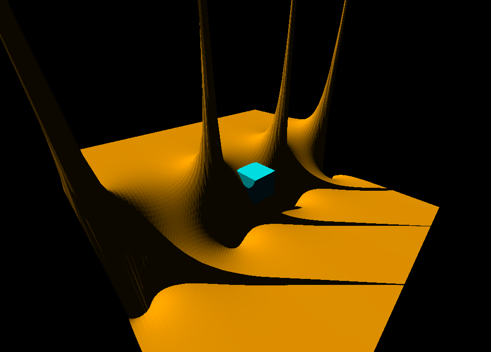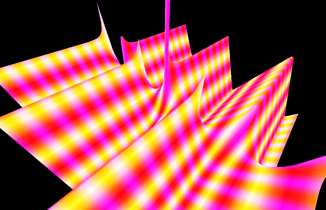 The image shown to the right shows a sample of the output from tan(x), where the X and Z dimensions are real and imaginary numbers respectivly, and the Y is the modulus (magnitude) of the output number (1).