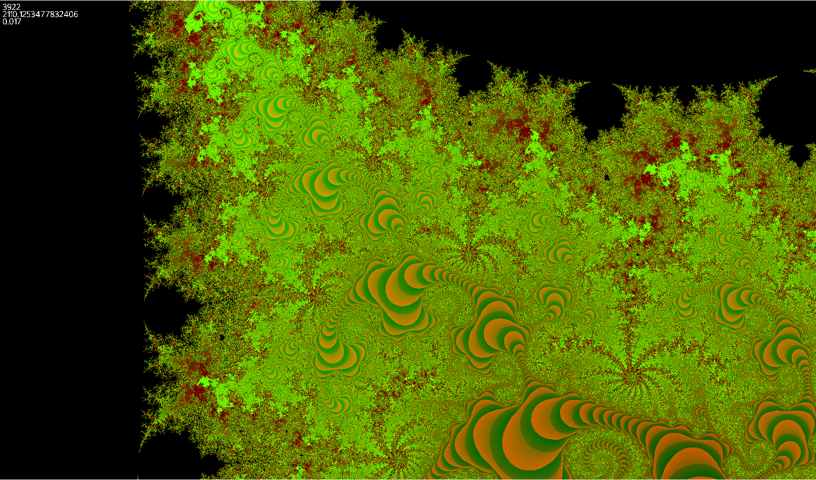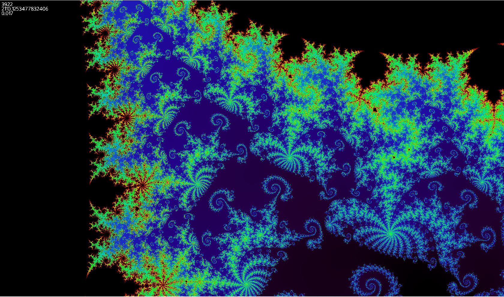In the corner of the screen are displayed the max iterations, the current zoom and the current frame time in seconds.